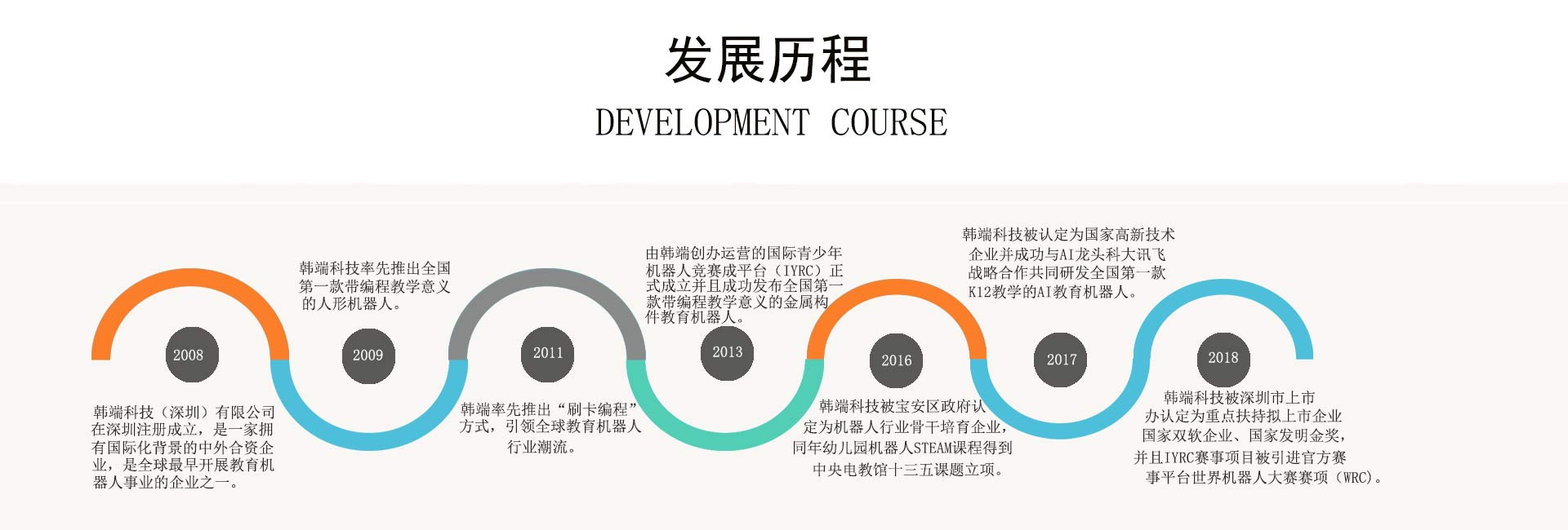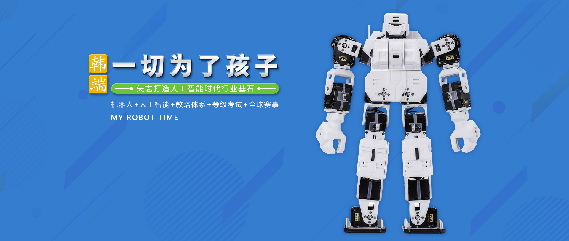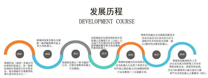 ABOUT US韓端科技(品牌:韓端、MY ROBOT TIME),于2008年在深圳成立,公司根植智能教育硬件賽道已經(jīng)14年之久,是深圳也是中國最早專注于這個細(xì)分領(lǐng)域的本土品牌之一。公司致力于向海內(nèi)外用戶提供以智能教育機器人為教學(xué)載體,覆蓋全學(xué)齡段的智能教育硬件產(chǎn)品和課程體系,是中國領(lǐng)先的機器人和人工智能編程教育產(chǎn)品技術(shù)服務(wù)商,也是我國青少年科學(xué)素質(zhì)教育行業(yè)的拓荒者之一。公司是教育部全國信息技術(shù)標(biāo)準(zhǔn)化技術(shù)委員會單位委員,中國教育技術(shù)協(xié)會人工智能專委會發(fā)起單位、北京大學(xué)學(xué)習(xí)科學(xué)實驗室深度合作單位、國際青少年機器人協(xié)會(聯(lián)合國NGO理事會觀察員)創(chuàng)始單位。