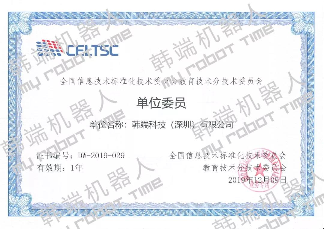 近年來,韓端機(jī)器人積極參與了《青少年編程能力等級(jí)標(biāo)準(zhǔn)》第一、第二部分的起草工作,組委會(huì)秘書處基于韓端機(jī)器人多年的研發(fā)能力、技術(shù)水平和多年在STEMA教育和機(jī)器人編程教育的成果與經(jīng)驗(yàn),同意韓端機(jī)器人作為單位委員加入全國信息技術(shù)標(biāo)準(zhǔn)化技術(shù)委員會(huì)教育技術(shù)分技術(shù)委員會(huì)。