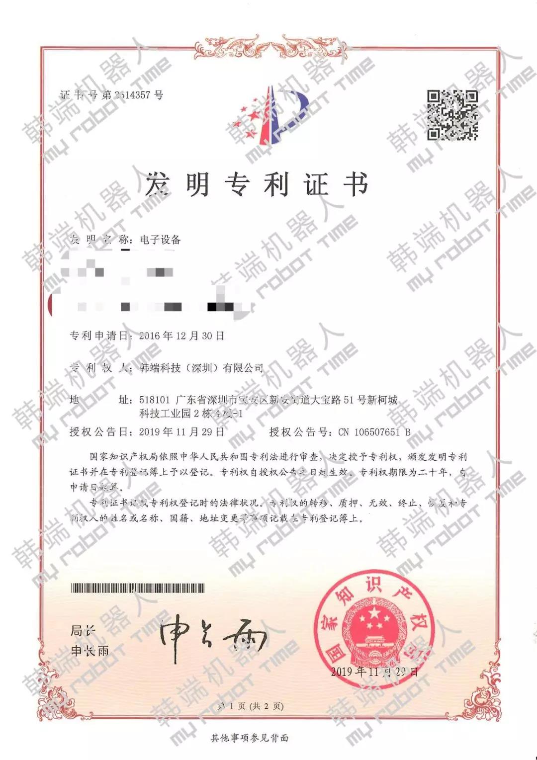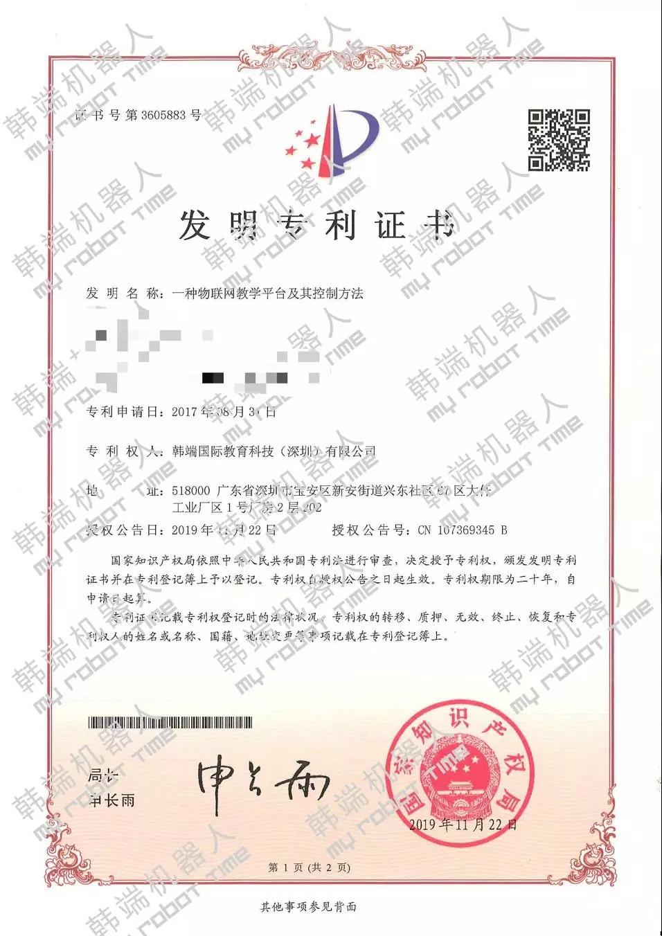 日前,韓端機(jī)器人項(xiàng)目名稱“電子設(shè)備”和“一種物聯(lián)網(wǎng)教學(xué)平臺及其控制方法”歷經(jīng)嚴(yán)格的形式審查、專家評審、相關(guān)部門聯(lián)審等程序,成功下發(fā)發(fā)明專利證書,自此韓端專利數(shù)突破百個(gè),攜手創(chuàng)新技術(shù)邁進(jìn)2020年。