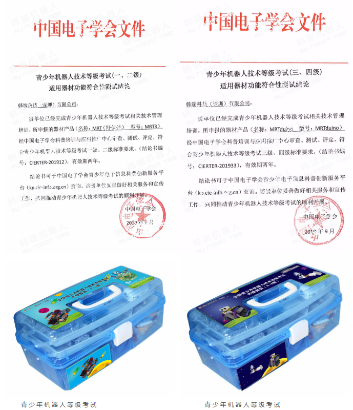 2019年韓端機器人產(chǎn)品經(jīng)評審被認(rèn)定為全國青少年機器人技術(shù)等級考試推薦器材,以下為電子學(xué)會授權(quán)文件以及1-2級、3-4級等級套裝: