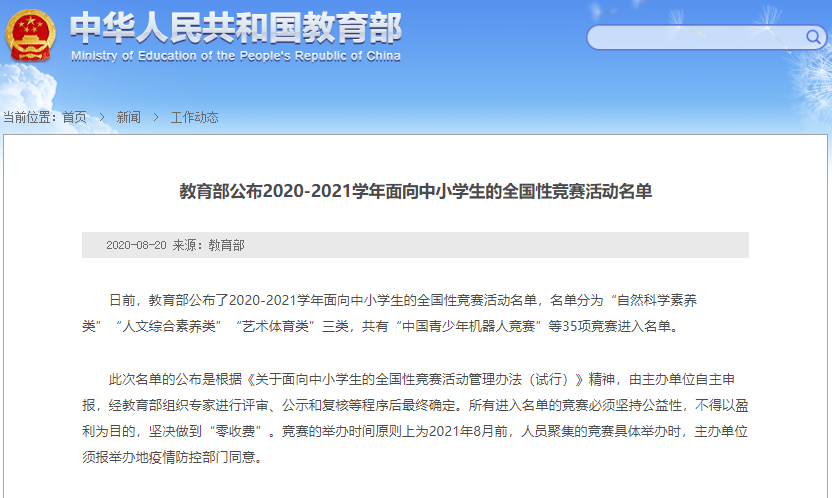 教育部公布的2020-2021學(xué)年面向中小學(xué)生的全國(guó)性競(jìng)賽活動(dòng)名單,名單分為“自然科學(xué)素養(yǎng)類”“人文綜合素養(yǎng)類”“藝術(shù)體育類”三類,共有“全國(guó)中小學(xué)信息技術(shù)創(chuàng)新與實(shí)踐大賽(NOC)”等多項(xiàng)科技競(jìng)賽進(jìn)入白名單。