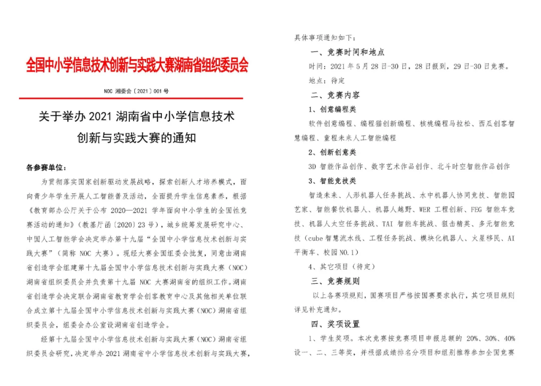 “全國(guó)中小學(xué)信息技術(shù)創(chuàng)新與實(shí)踐大賽”是一項(xiàng)運(yùn)用信息技術(shù),培養(yǎng)廣大師生的創(chuàng)新精神和實(shí)踐能力,面向青少年學(xué)生開展人工智能科學(xué)普及、引領(lǐng)科技創(chuàng)新的素質(zhì)教育實(shí)踐平臺(tái),簡(jiǎn)稱NOC大賽(NOC為Novelty, Originality, Creativity的縮寫)。