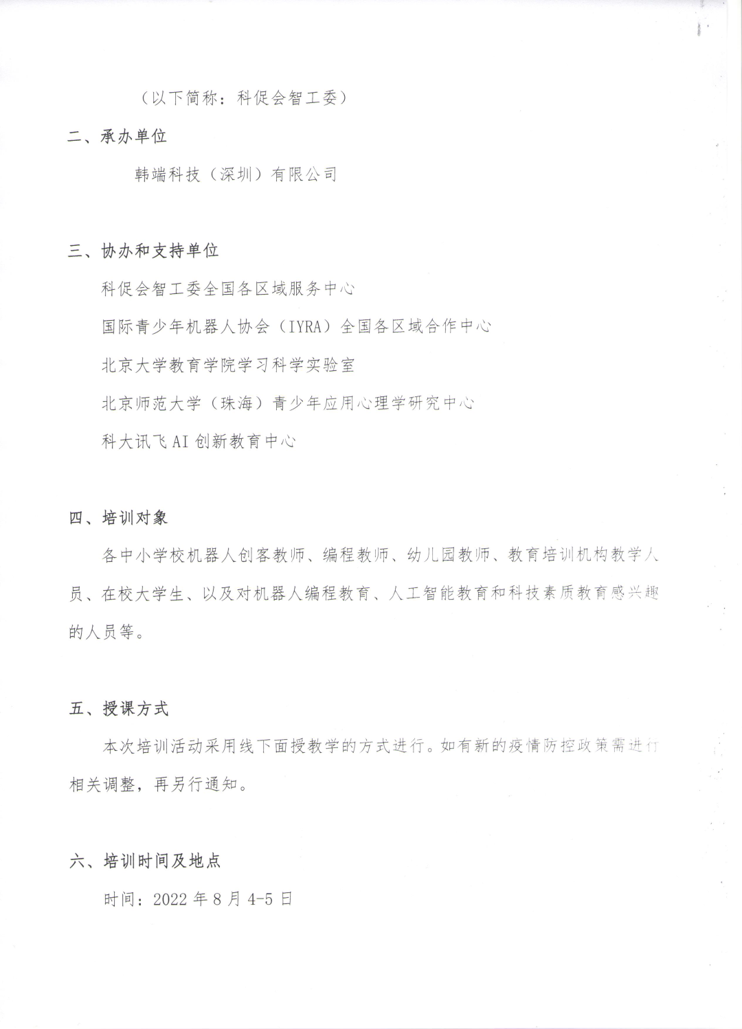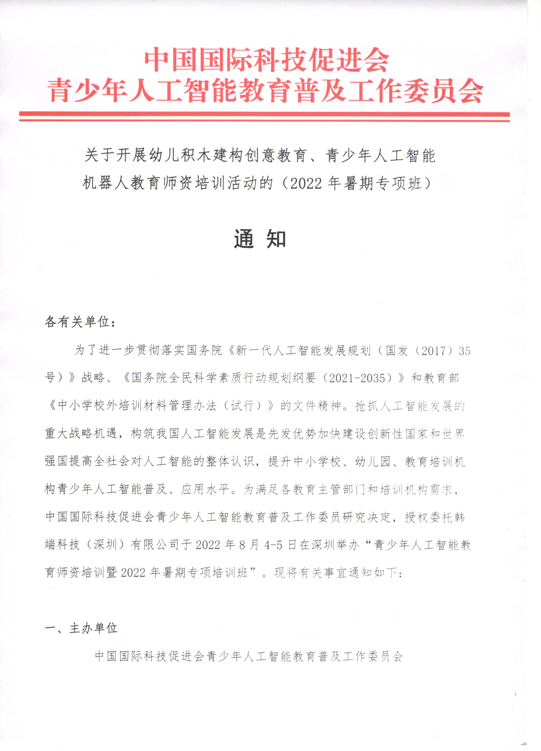 為了進(jìn)一步貫徹落實(shí)國(guó)務(wù)院《新一代人工智能發(fā)展規(guī)劃(國(guó)發(fā)(2017)35號(hào))》戰(zhàn)略、《國(guó)務(wù)院全民科學(xué)素質(zhì)行動(dòng)規(guī)劃綱要(2021-2035)》和教育部《中小學(xué)校外培訓(xùn)材料管理辦法(試行)》的文件精神。搶抓人工智能發(fā)展的重大戰(zhàn)略機(jī)遇,構(gòu)筑我國(guó)人工智能發(fā)展是先發(fā)優(yōu)勢(shì)加快建設(shè)創(chuàng)新性國(guó)家和世界強(qiáng)國(guó)提高全社會(huì)對(duì)人工智能的整體認(rèn)識(shí),提升中小學(xué)校、幼兒園、教育培訓(xùn)機(jī)構(gòu)青少年人工智能普及、應(yīng)用水平。為滿(mǎn)足各教育主管部門(mén)和培訓(xùn)機(jī)構(gòu)需求,中國(guó)國(guó)際科技促進(jìn)會(huì)青少年人工智能教育普及工作委員研究決定,授權(quán)委托韓端科技(深圳)有限公司于2022年8月4-5日在深圳舉辦“青少年人工智能教育師資培訓(xùn)暨2022年暑期專(zhuān)項(xiàng)培訓(xùn)班”?,F(xiàn)將有關(guān)事宜通知如下:
