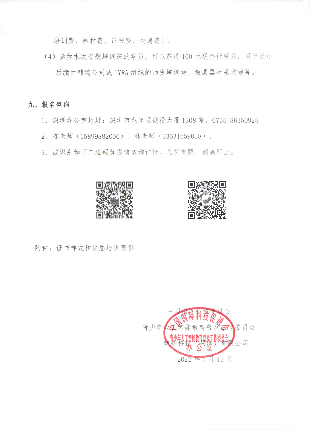 1、深圳辦公室地址:深圳市龍崗區(qū)創(chuàng)投大廈1308室,0755-863509252、聯(lián)系人:陳老師(15899882056)、林老師(13631559018)3、或識(shí)別如下二維碼加微信咨詢(xún)?cè)斍?。名額有限,額滿(mǎn)即止。
