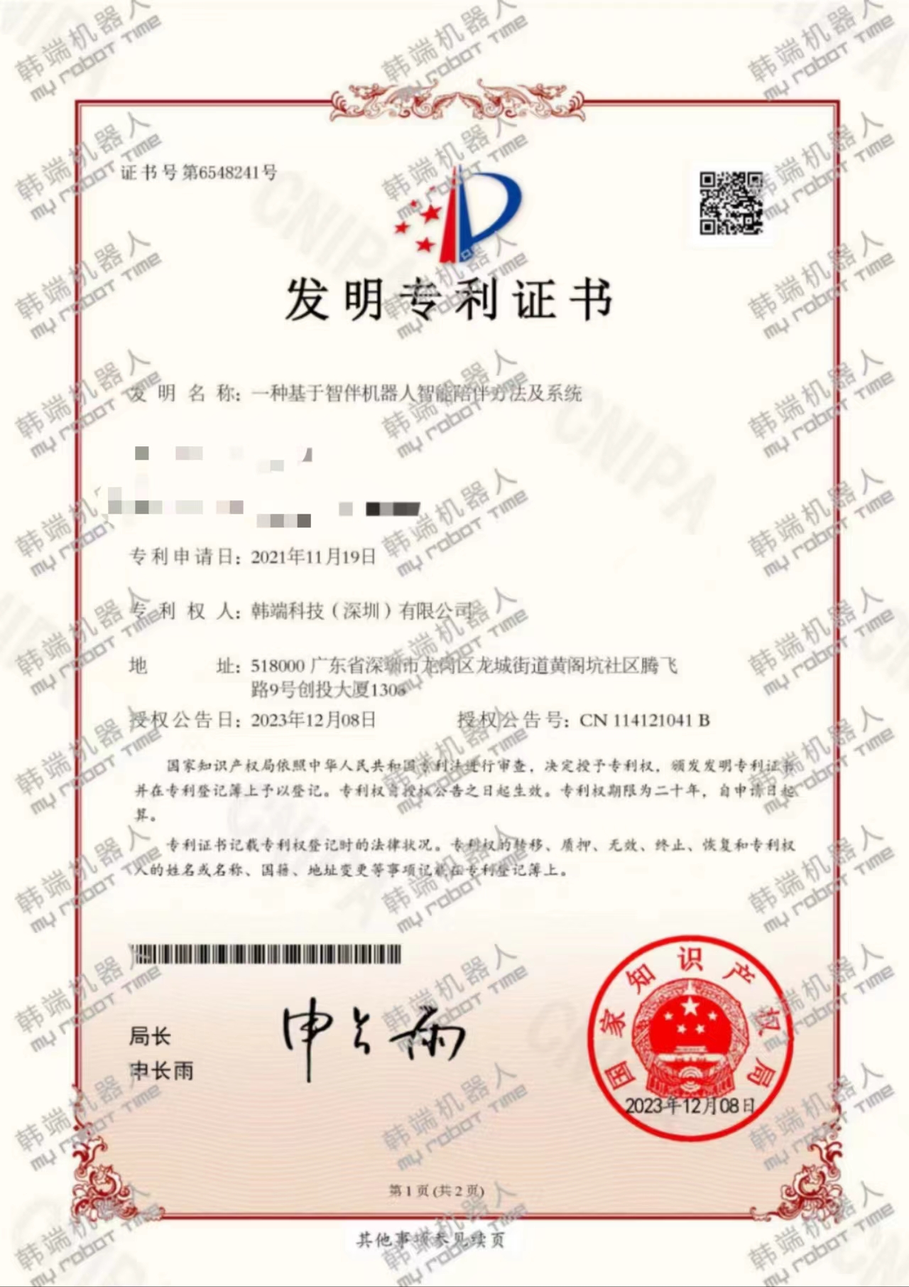 近日,韓端人工智能項(xiàng)目名稱“一種基于智伴機(jī)器人智能陪伴方法及系統(tǒng)” 歷經(jīng)嚴(yán)格的形式審查、專家評審、相關(guān)部門聯(lián)審等程序,已經(jīng)成功下發(fā)發(fā)明專利證書。本項(xiàng)發(fā)明專利主要涉及到智能陪伴技術(shù)領(lǐng)域,通過采用自然語言處理、情感識別等技術(shù),使得智伴機(jī)器人能夠更好地理解用戶的需求和情感,從而提供更加貼心、個性化的陪伴服務(wù),也可以實(shí)現(xiàn)遠(yuǎn)程陪伴的效果。