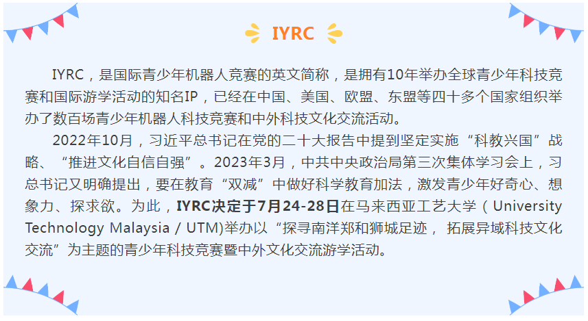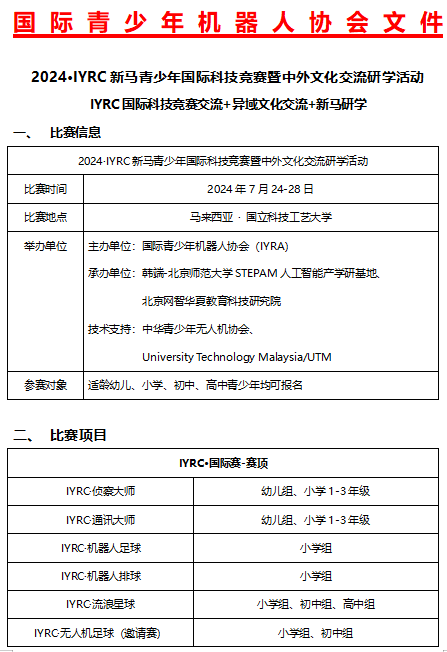 關(guān)于舉辦2024IYRC國際青少年機器人競賽(新馬)邀請賽暨科技研學(xué)活動的通知