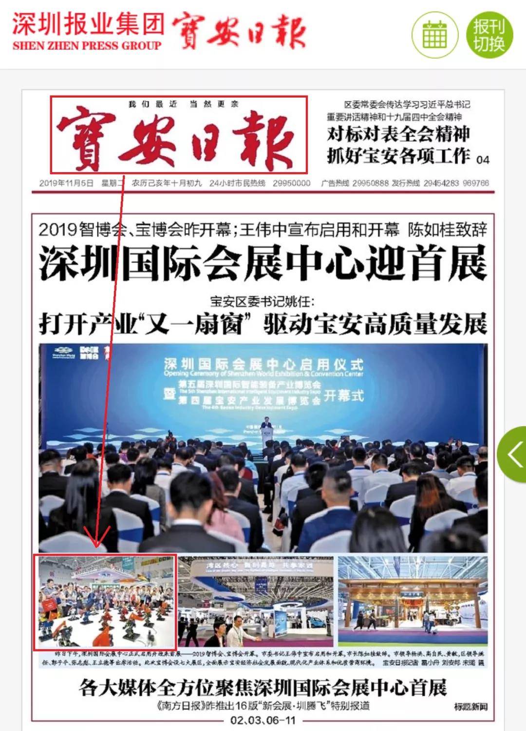 日前,2019寶安產(chǎn)業(yè)發(fā)展博覽會(huì)在深圳國(guó)際會(huì)展中心順利閉幕,韓端機(jī)器人攜帶人氣產(chǎn)品精彩亮相十大產(chǎn)業(yè)鏈展區(qū)核心位置,備受?chē)?guó)家工信部、商務(wù)部及深圳市委市政府領(lǐng)導(dǎo)稱贊,寶安區(qū)委書(shū)記姚任同志帶領(lǐng)寶安區(qū)委區(qū)政府各級(jí)領(lǐng)導(dǎo)親臨韓端展位仔細(xì)觀摩指導(dǎo),并被寶安日?qǐng)?bào)重點(diǎn)報(bào)道。