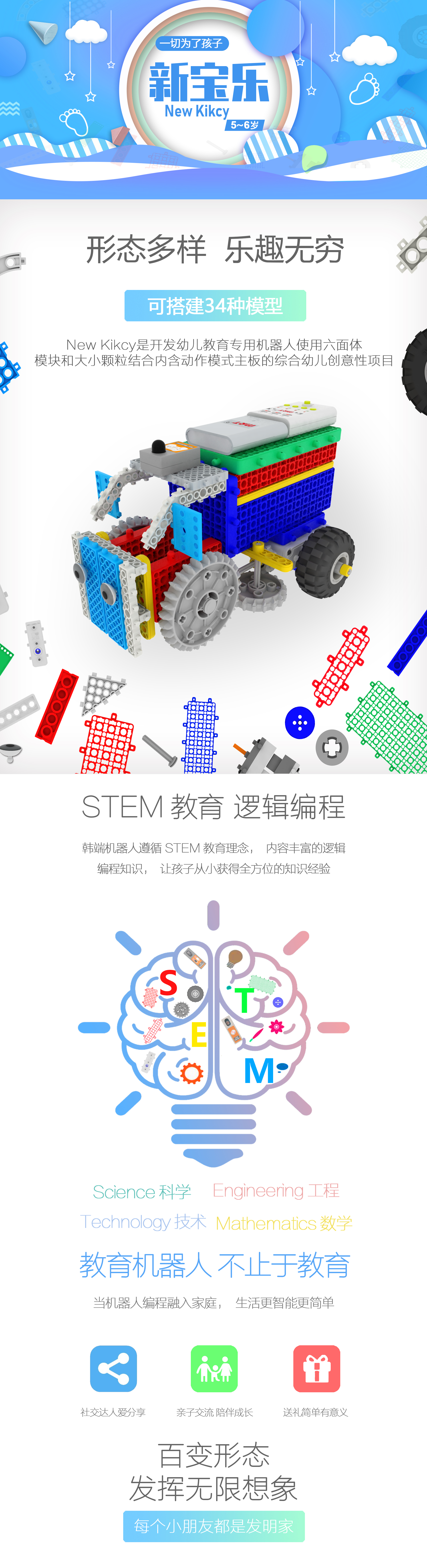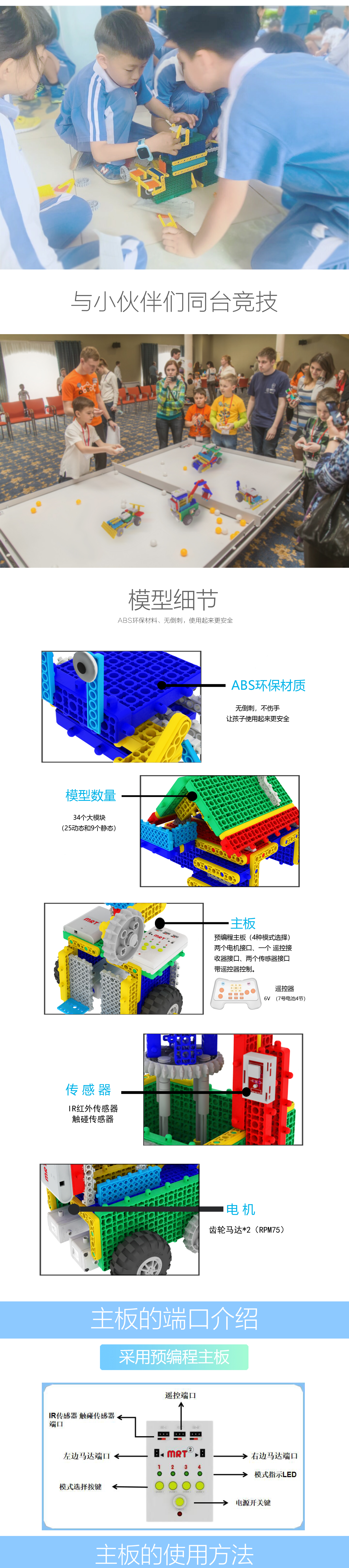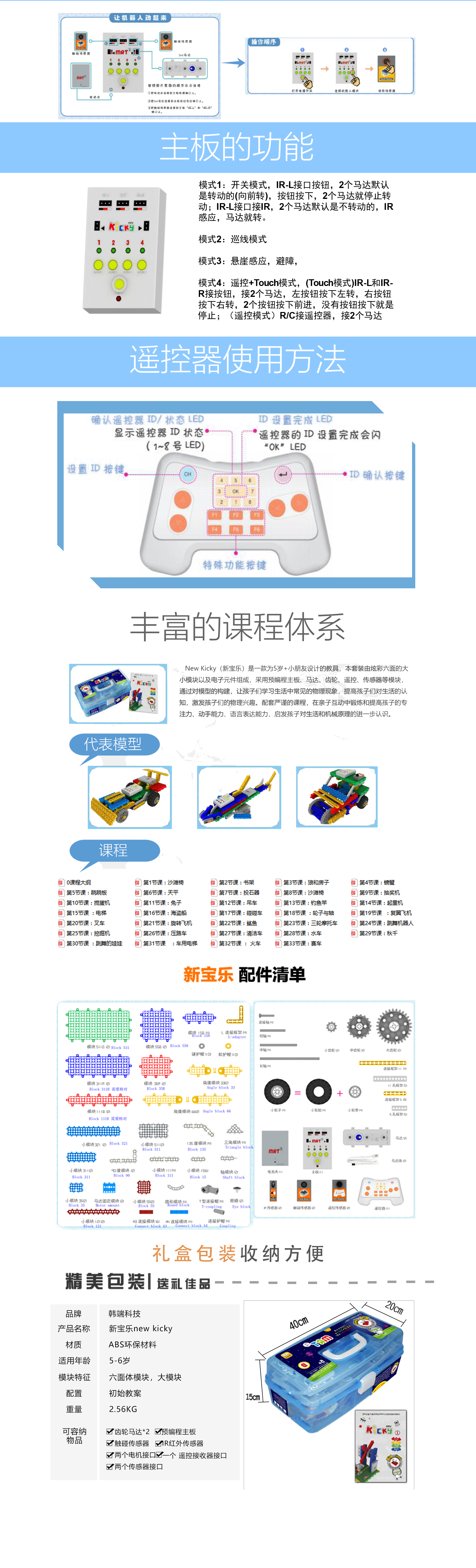 功 能:DIY 教學,動靜結(jié)合,形象生動。主板為開關按鈕控制模式,多按鈕選擇設計,配套遙控器,讓機器人操作顯得簡潔而簡單,配套傳感器,增強物理認識。