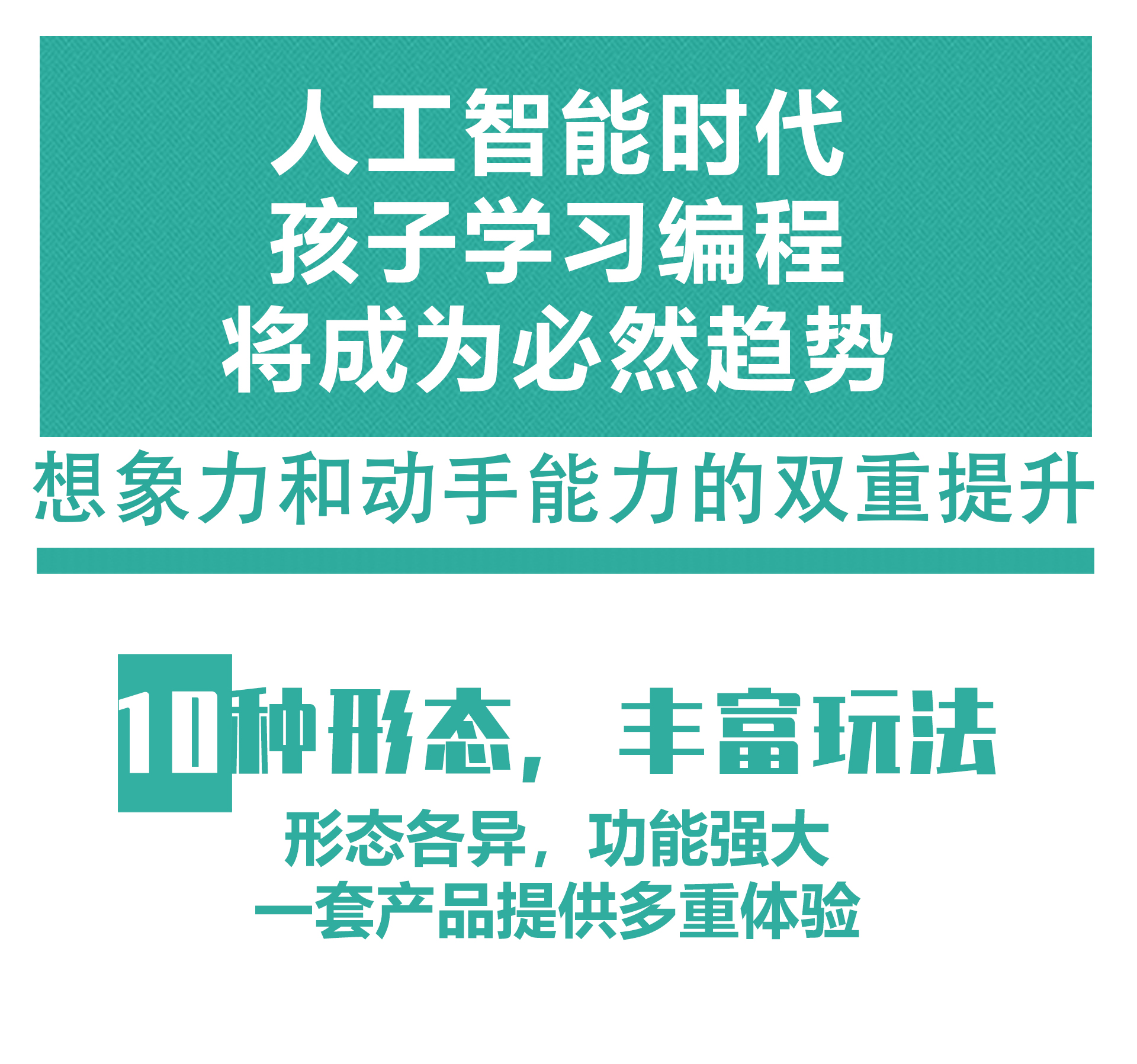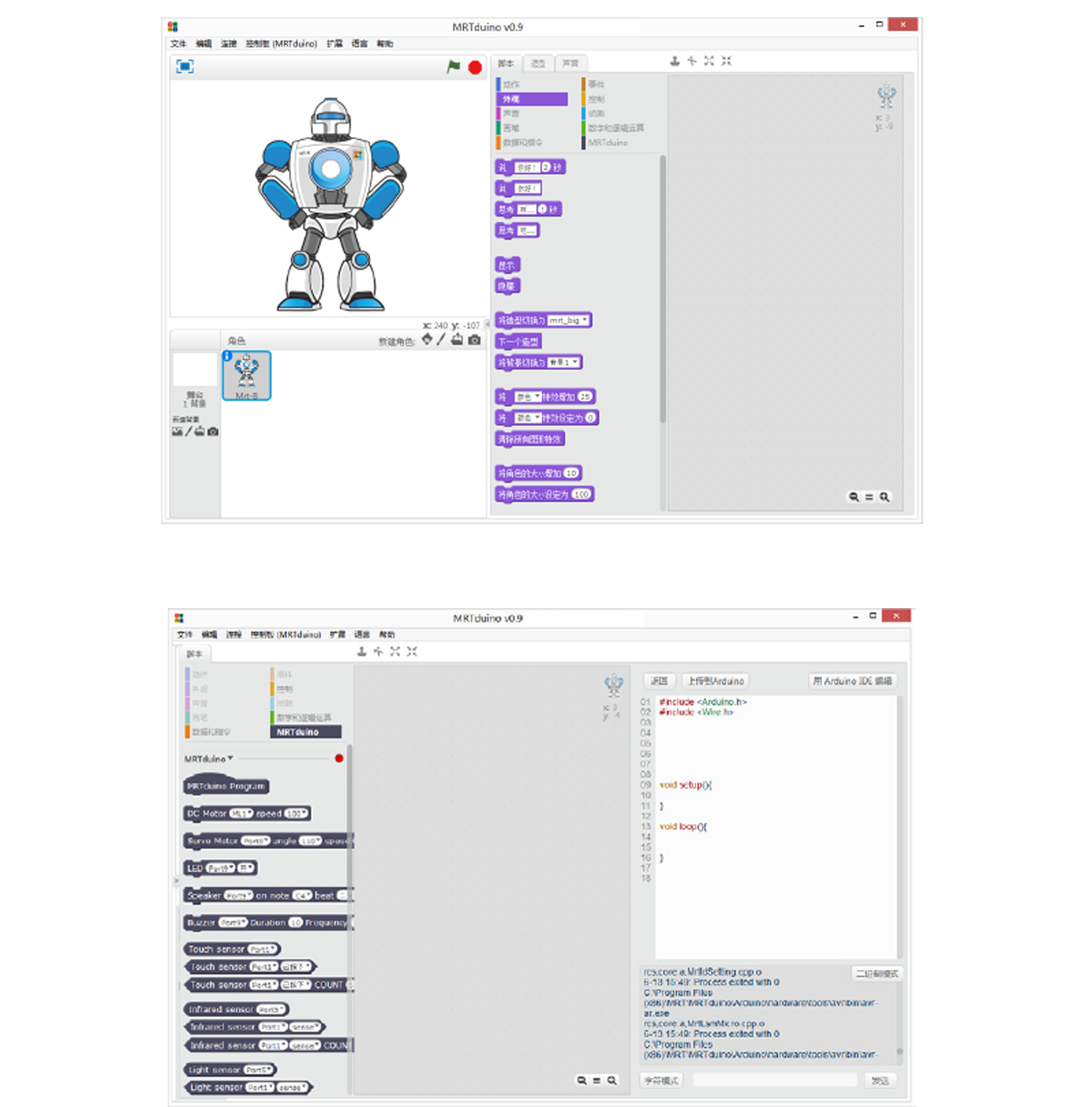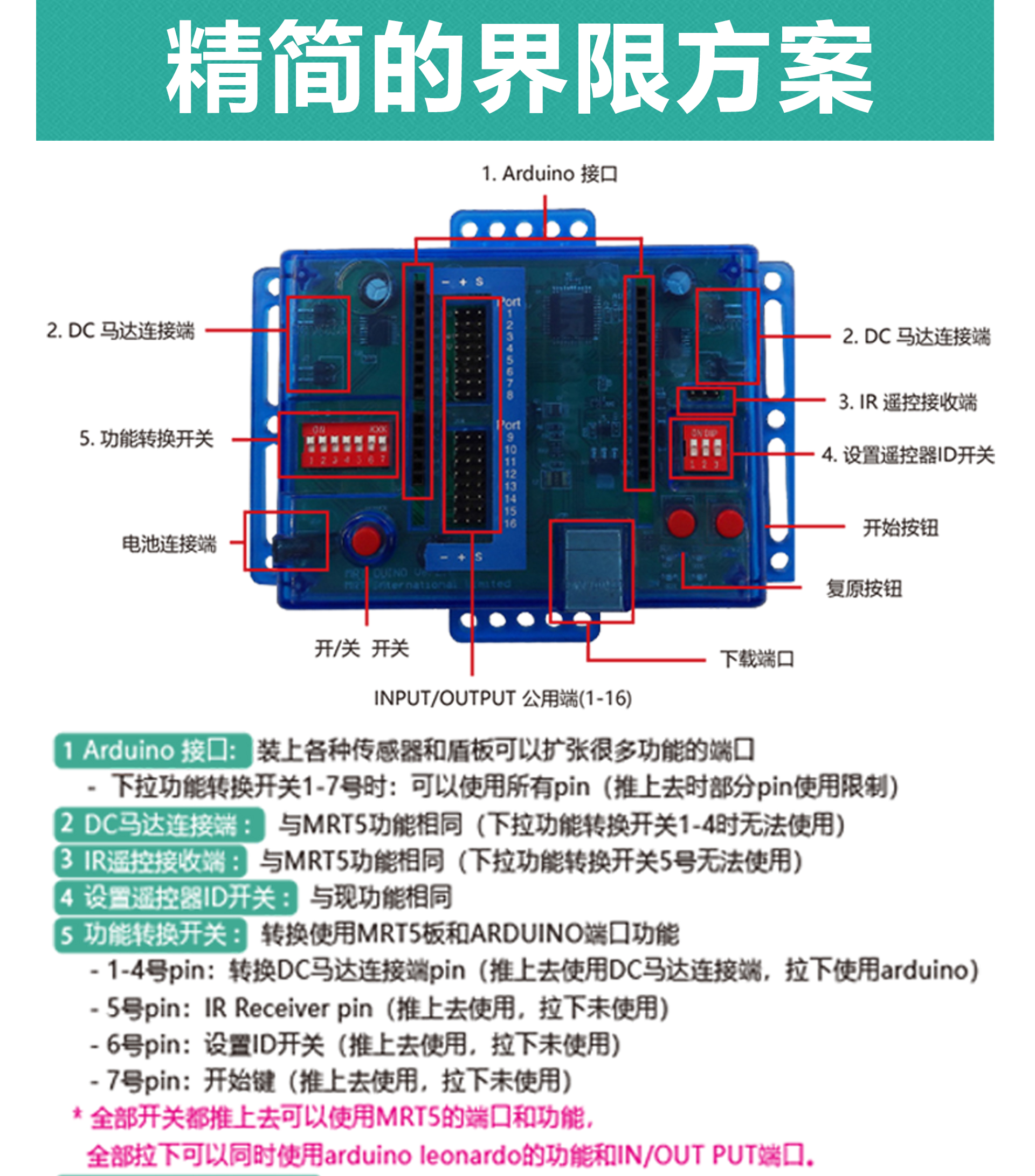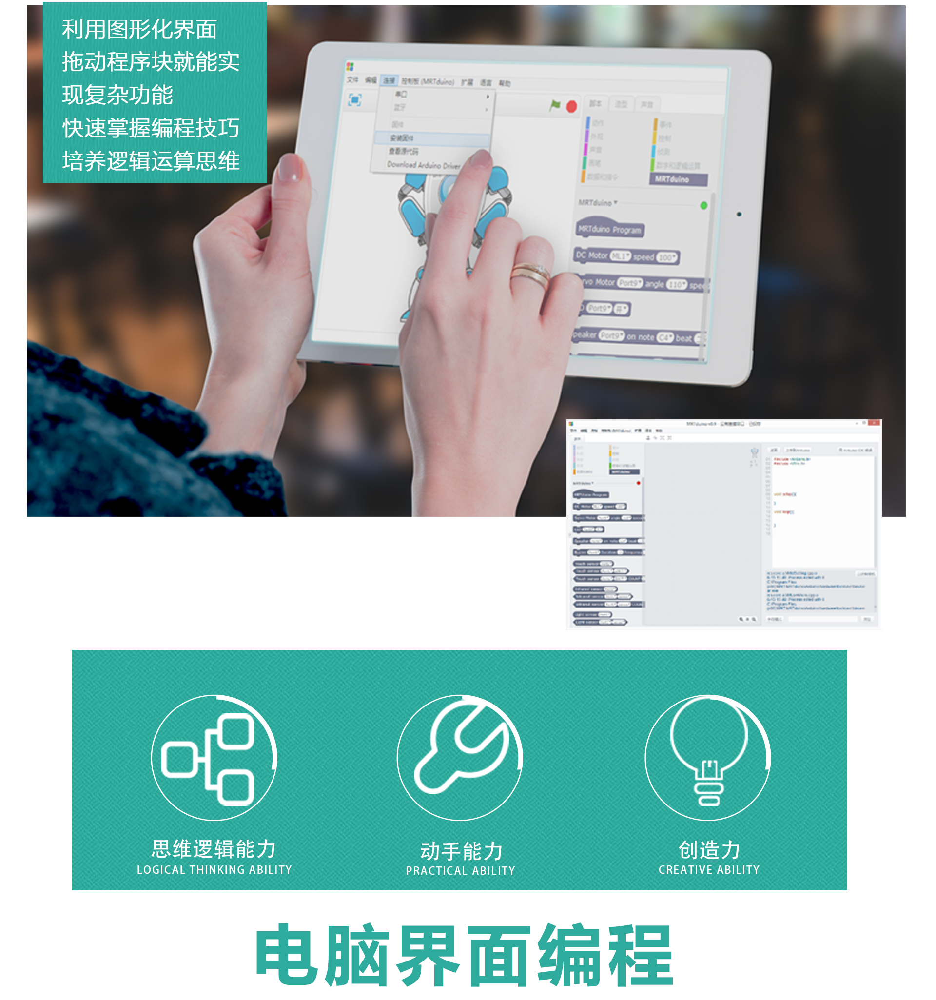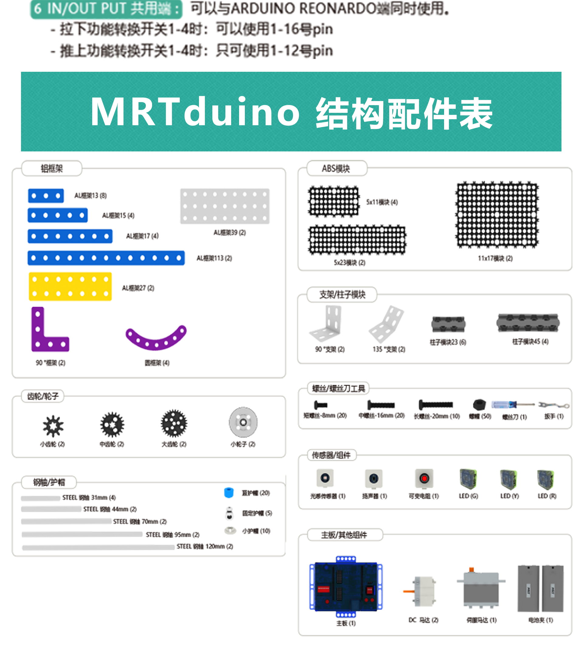 產(chǎn)品參數(shù) 產(chǎn)品名稱:MRT-Duino 外觀顏色:多彩積木 產(chǎn)品材料:金屬鋁模塊及六面體積木模塊結(jié)合 電 機(jī):DC馬達(dá)*2,伺服馬達(dá)*1 主 板:MRT-Duino主板,PC端圖形化編程,4個電機(jī)接口,8個輸入端,8個輸出端,預(yù)留擴(kuò)展接口 軟 件:MRT-Duino軟件 傳 感 器:電位器傳感器1個、聲音傳感器1個、LED傳感器3個 CDS傳感器1個 模型數(shù)量:10個(10個動態(tài)) 額定電壓:6V (5號電池4節(jié)) 功 能:DIY 教學(xué),主板為單片機(jī)控制模式,Arduino圖形化編程。 適用年齡:9歲+ 配 置:初始教案 包裝尺寸:寬250*厚350*高90mm 透明塑料箱包裝 備注:MRT-Duino的開發(fā)綜合了Scratch和Arduino這兩款編程工具,編程軟件的界面支持多種語言任意切換。